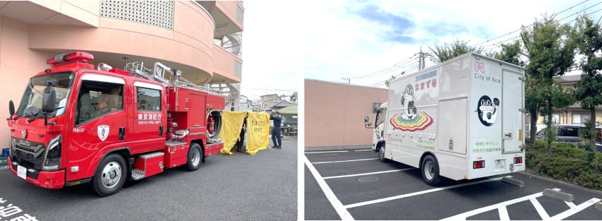 焼きそば、わたあめなどの軽食、各種ドリンクやゲームコーナーに加え、今年は東京都北区危機管理室と赤羽消防署志茂出張所のご協力の下、「煙体験テント」、「地震体験車」を設置し、防災体験の場を設けることができました。